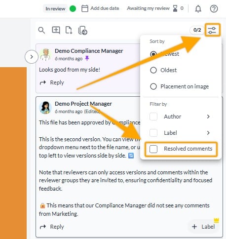 You’d like to see the resolved comments again? You can Unhide resolved comments by clicking on the eye icon again.